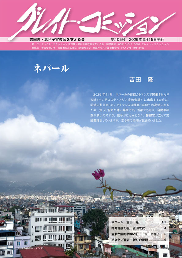 グレイトコミッション105号 2026年3月13日 最終更新日時 : 2026年3月11日 ofce@great-com グレイトコミッション105号をお読みいただけます。 グレイトコミッションを読む 2026年3月15日発行 Facebook